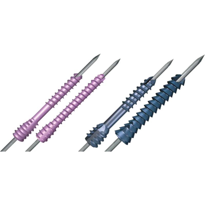 - eine „perkutane“ Schraube mit durchgehendem Gewinde, die selbstschneidend und selbstbohrend ist, jedoch keine Kompression erzeugt.