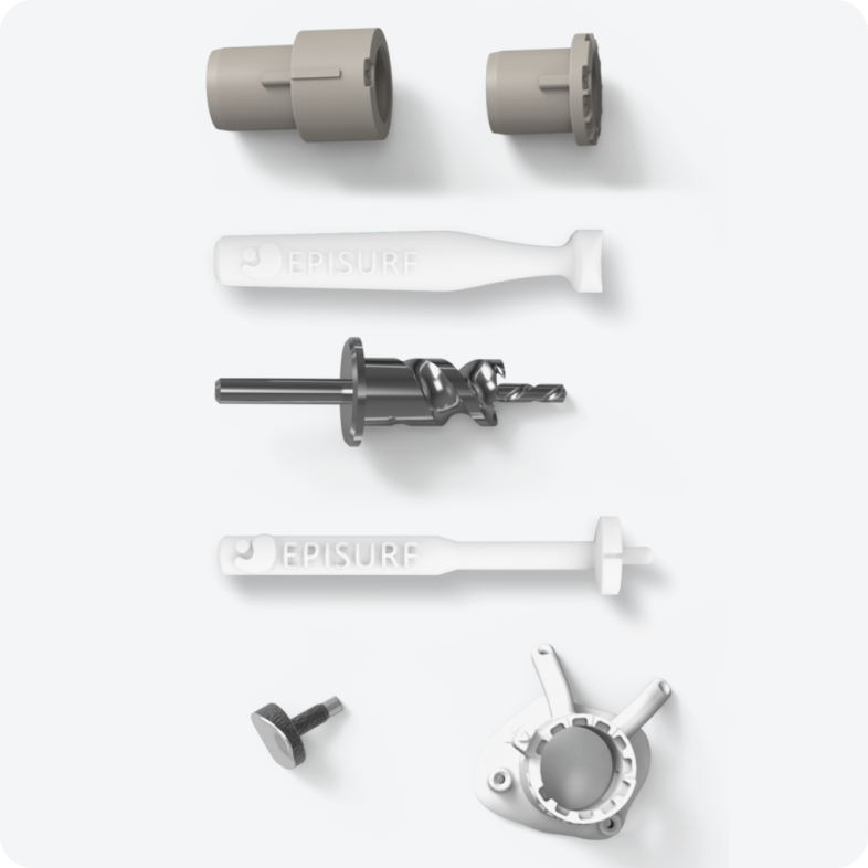 Das Episealer-Implantat wird mit einer individuellen Bohrschablone, Epiguide, und einem Satz dazugehöriger Instrumente geliefert, die für ein optimales Ergebnis erforderlich sind.